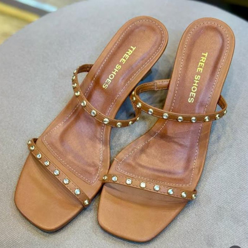 Tamanco Tree Shoes Caramelo com Tiras Finas e Aplicações em Pedrinhas